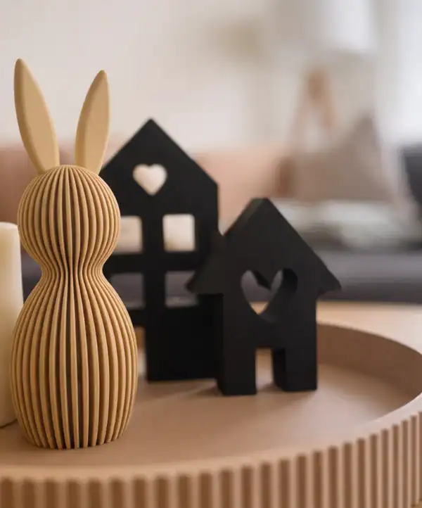 Ein charmanter Hase, der in verschiedenen Grössen gedruckt werden kann. Ich habe mehrere Drucke in unterschiedlichen Farbtönen erstellt – von klassischem Braun bis zu fröhlichem Gelb. Mit seinen 3D-gedruckten Hasenohren und dem fein strukturierten Körper fügt sich dieser Osterhase perfekt in meine bereits bestehende Deko ein. (Filament PLA Matte* in Wüstenbraun.)